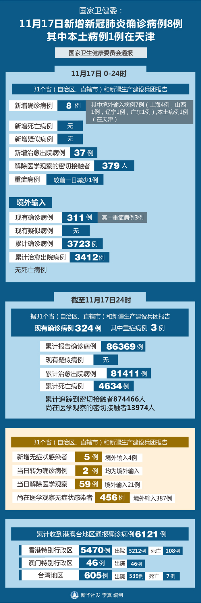 截至11月17日24時,據(jù)31個?。ㄗ灾螀^(qū)、直轄市)和新疆生產(chǎn)建設(shè)兵團(tuán)報告,現(xiàn)有確診病例324例(其中重癥病例3例),累計治愈出院病例81411例,累計死亡病例4634例,累計報告確診病例86369例,無現(xiàn)有疑似病例。累計追蹤到密切接觸者874466人,尚在醫(yī)學(xué)觀察的密切接觸者13974人。