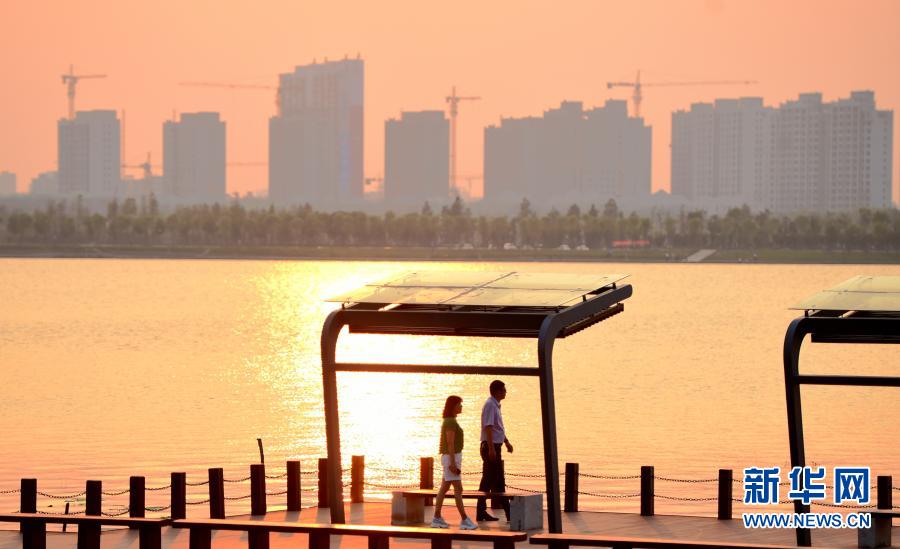 市民在駐馬店市新蔡縣東湖景觀大道休閑(2019年6月13日攝)。新華社發(fā)