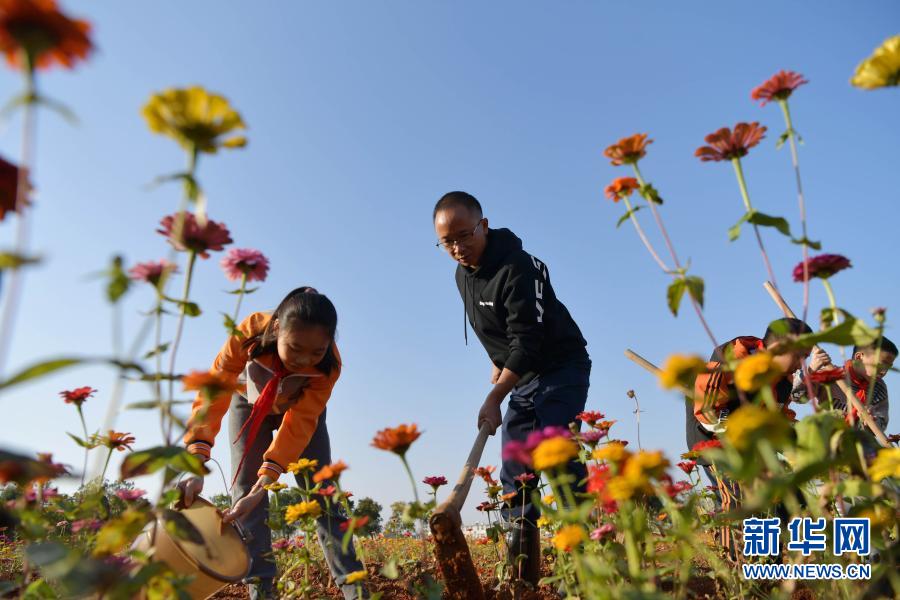 江西省宜春市袁州區(qū)寨下中心小學(xué)學(xué)生在花田勞動(11月9日攝)。新華社記者 彭昭之 攝