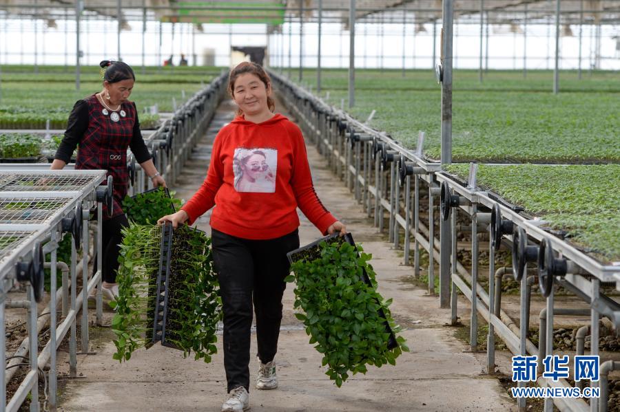 在新疆阿克陶縣現(xiàn)代設(shè)施農(nóng)業(yè)產(chǎn)業(yè)扶貧基地,工人在育苗溫室內(nèi)搬運(yùn)菜苗(3月22日攝)。新華社記者 丁磊 攝