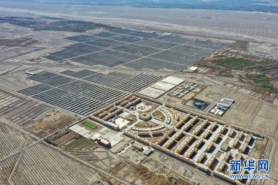 這是新疆阿克陶縣易地扶貧搬遷點(diǎn)的阿克陶縣現(xiàn)代設(shè)施農(nóng)業(yè)產(chǎn)業(yè)扶貧基地和阿克陶縣昆侖佳苑小區(qū)(3月22日攝,無人機(jī)照片)。新華社記者 丁磊 攝