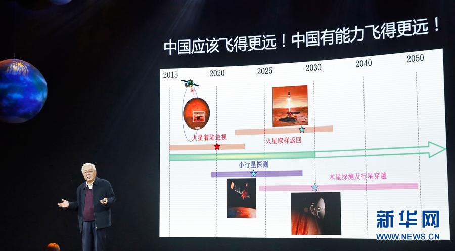 “這次嫦娥五號肩負(fù)著月球采樣返回的光榮使命,我們的天問一號也正在飛向火星的路上,我們還要飛得更遠(yuǎn),去探測木星、小行星并建設(shè)我們的國際月球科研站。中國已經(jīng)昂首進(jìn)入了深空探測的新時(shí)代?!睔W陽自遠(yuǎn)說。