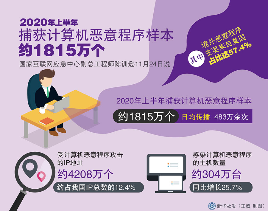 新華社杭州11月25日電(記者溫競?cè)A、朱涵)國家互聯(lián)網(wǎng)應急中心副總工程師陳訓遜24日說,國家互聯(lián)網(wǎng)應急中心對我國網(wǎng)絡安全態(tài)勢監(jiān)測數(shù)據(jù)顯示,2020年上半年捕獲計算機惡意程序樣本約1815萬個,日均傳播次數(shù)483萬余次。其中境外惡意程序主要來自美國,占比達57.4%。
