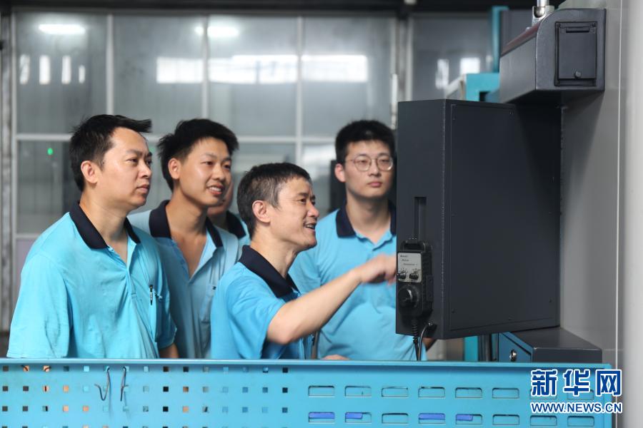 全國勞動模范、寧波中大力德智能傳動股份有限公司設備科科長萬亞勇(右二)在車間指導員工進行數控機床故障診斷(8月17日攝)。新華社發(fā)