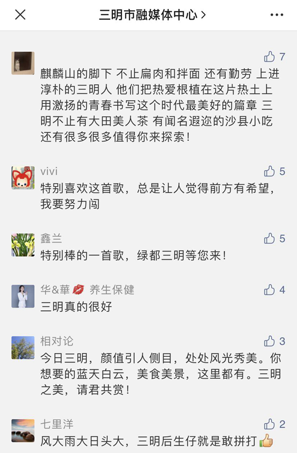 “我大福建真是處處美得沒話說!”“哈哈,我大沙縣又壓軸了。”“太好聽了!內心充滿自豪!”“開門見綠,抬頭見藍,這就是我的家鄉(xiāng)?!边€有網友希望這首歌“能上春晚”。更有網友吟誦起三明,“好山好水好風情,數(shù)一數(shù)二數(shù)三明。紅軍長征出發(fā)地,客家文化傳世界 …… ”