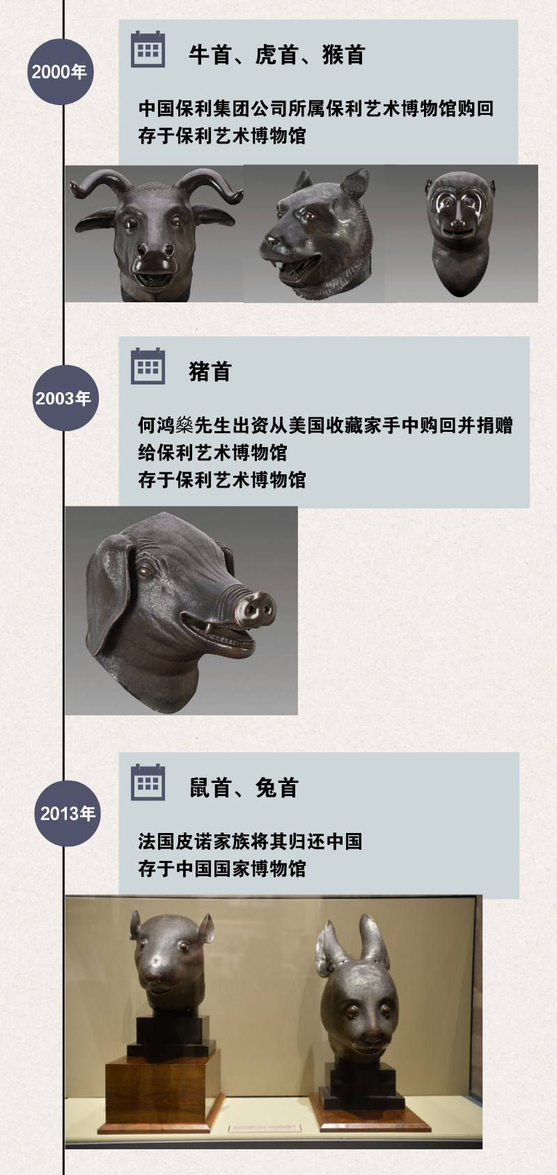 牛首、虎首、猴首、豬首、鼠首和兔首銅像都已通過不同方式回到祖國懷抱。2019年,它們和馬首銅像曾“相聚”在國家文物局主辦的“回歸之路—新中國成立70周年流失文物回歸成果展”。