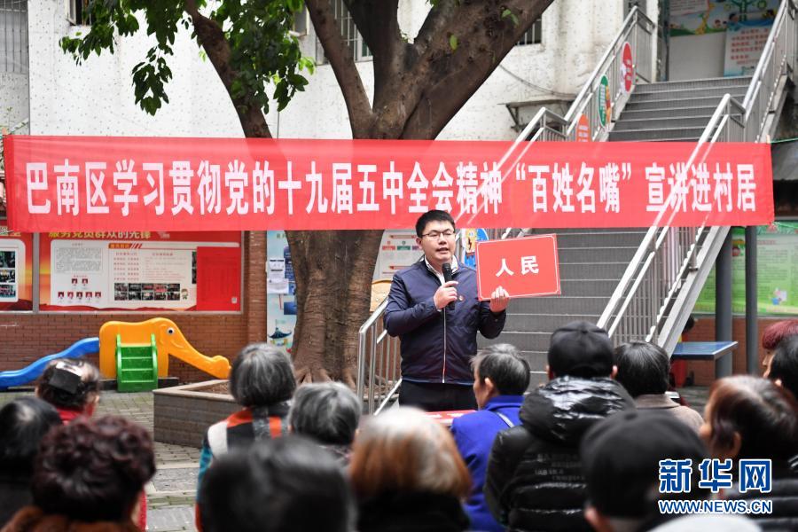 12月1日,宣講員向群眾宣講黨的十九屆五中全會精神。12月1日,重慶市巴南區(qū)魚洞街道魚新街社區(qū)舉行學(xué)習(xí)貫徹黨的十九屆五中全會精神“百姓名嘴”進(jìn)村居活動。據(jù)介紹,重慶市巴南區(qū)“百姓名嘴”宣講團(tuán)是由基層干部、教師、民間藝人等基層理論骨干自愿組成的理論宣講隊伍,現(xiàn)有宣講員85名。宣講團(tuán)成員將理論宣講與評書、快板、三句半、木洞山歌等文藝形式相結(jié)合,目前已在巴南區(qū)開展了110余場學(xué)習(xí)貫徹黨的十九屆五中全會精神宣講活動。新華社記者 唐奕 攝