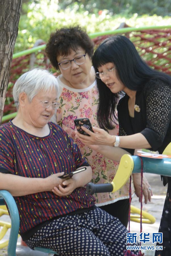 龍澤苑社區(qū)黨支部書記、居委會主任伊然(右)在社區(qū)內(nèi)教老年人使用手機里的社區(qū)服務(wù)軟件(8月10日攝)。新華社記者 李欣 攝