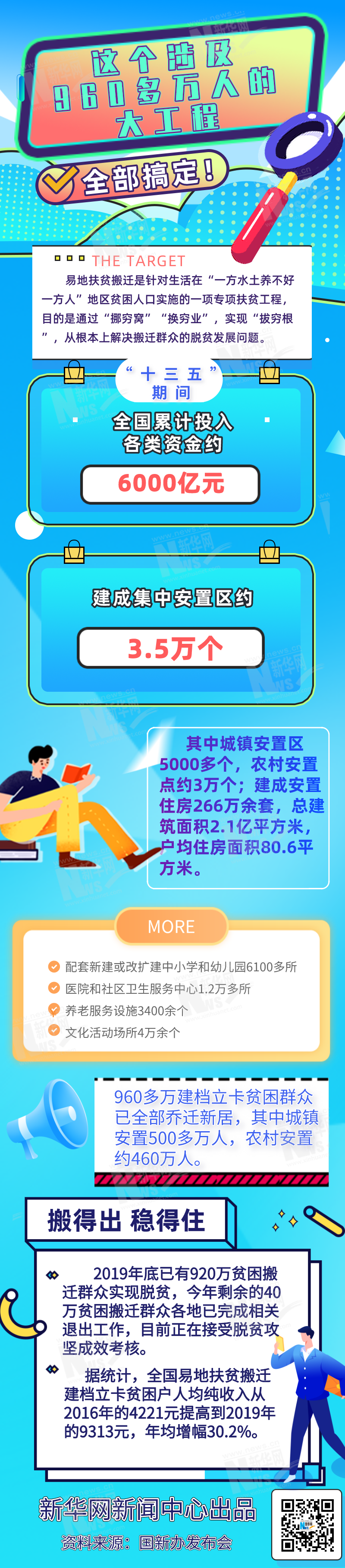 據(jù)了解,易地扶貧搬遷是針對生活在“一方水土養(yǎng)不好一方人”地區(qū)貧困人口實(shí)施的一項(xiàng)專項(xiàng)扶貧工程,目的是通過“挪窮窩”“換窮業(yè)”,實(shí)現(xiàn)“拔窮根”,從根本上解決搬遷群眾的脫貧發(fā)展問題。記者從發(fā)布會了解到,當(dāng)前我國已建成城鎮(zhèn)安置區(qū)5000多個,農(nóng)村安置點(diǎn)約3萬個;建成安置住房266萬余套,總建筑面積2.1億平方米,戶均住房面積80.6平方米;配套新建或改擴(kuò)建中小學(xué)和幼兒園6100多所、醫(yī)院和社區(qū)衛(wèi)生服務(wù)中心1.2萬多所、養(yǎng)老服務(wù)設(shè)施3400余個、文化活動場所4萬余個。