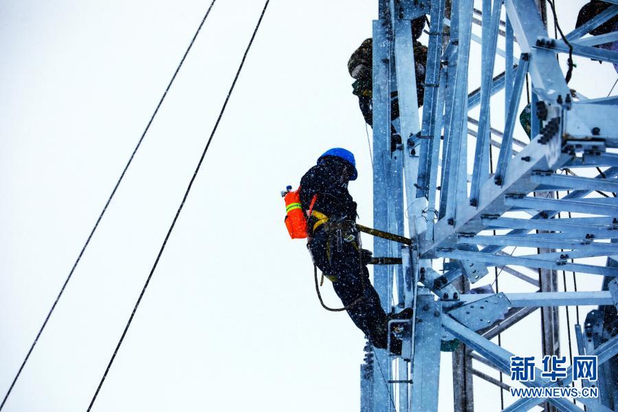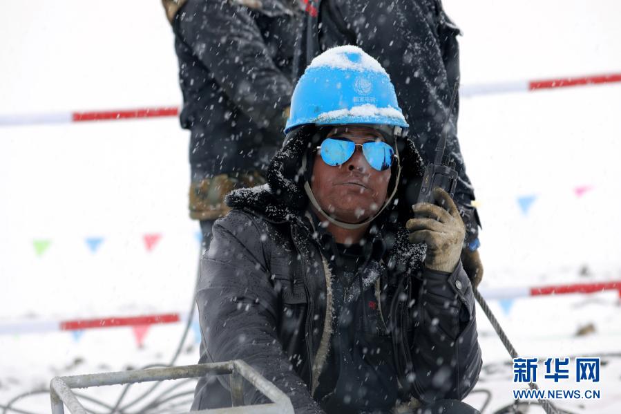 在西藏日喀則市定日縣,西藏阿里與藏中電網(wǎng)聯(lián)網(wǎng)工程線路4標(biāo)段施工人員在風(fēng)雪中作業(yè)(5月2日攝)。新華社發(fā)