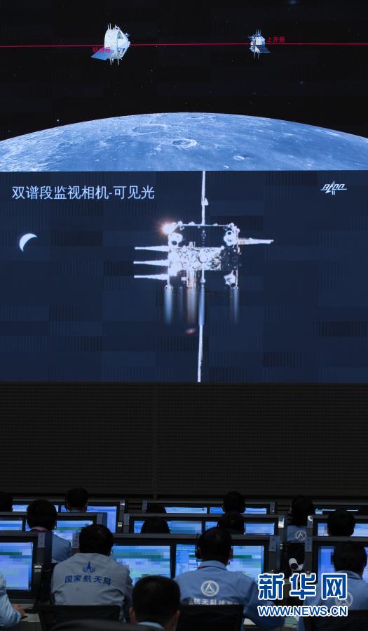 記者從國家航天局獲悉,12月6日5時42分,嫦娥五號上升器成功與軌道器返回器組合體交會對接,并于6時12分將月球樣品容器安全轉移至返回器中。這是我國航天器首次實現(xiàn)月球軌道交會對接。新華社記者 金立旺 攝