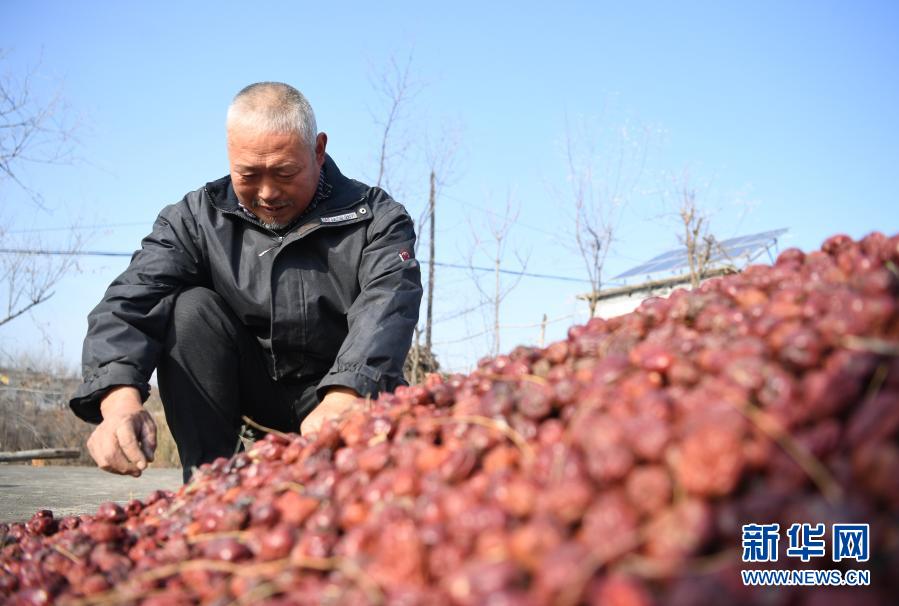 河北省阜平縣東城鋪村建檔立卡貧困戶(hù)劉國(guó)旗在家中挑揀晾曬的大棗(11月25日攝)。新華社記者 朱旭東 攝