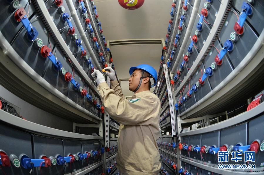在江蘇省灌云縣開山島,國家電網(wǎng)的施工人員在調(diào)試“風光儲互補智能微電網(wǎng)系統(tǒng)”的蓄電池組(2019年6月18日攝)。新華社發(fā)(萬程鵬 攝)