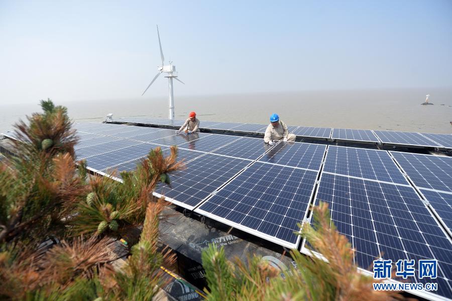 在江蘇省灌云縣開山島,國家電網(wǎng)的施工人員在屋頂上檢查光伏面板運行情況(2019年6月18日攝)。新華社發(fā)(萬程鵬 攝)
