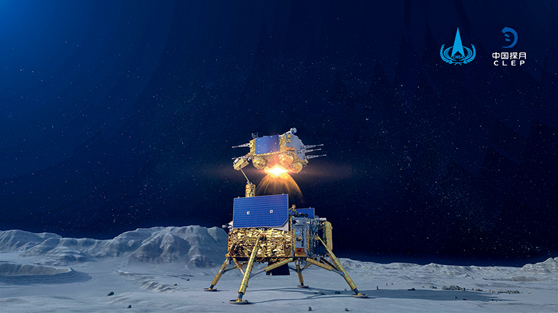 12月3日23時(shí)10分,嫦娥五號(hào)上升器月面點(diǎn)火,3000 牛發(fā)動(dòng)機(jī)工作約6 分鐘后,順利將攜帶月壤的上升器送入到預(yù)定環(huán)月軌道,成功實(shí)現(xiàn)我國(guó)首次地外天體起飛。這是嫦娥五號(hào)上升器月面點(diǎn)火瞬間模擬 圖國(guó)家航天局供圖