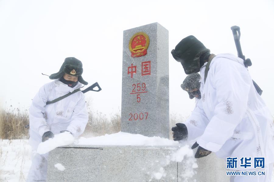 東極哨所官兵清理界碑上的積雪(2017年11月15日攝)。新華社發(fā)(李寶成 攝)