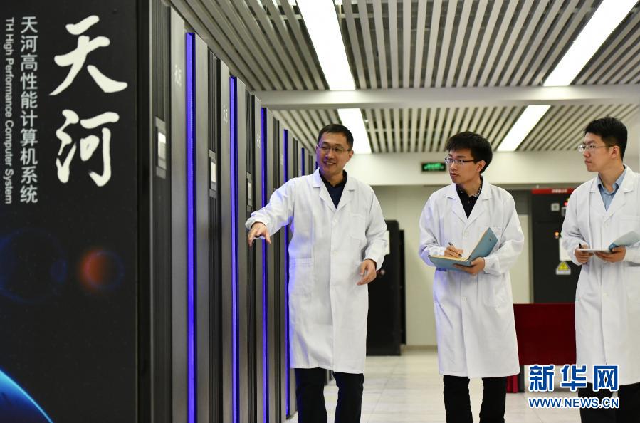 在國家超級計算天津中心“天河三號”原型機機房內(nèi),應用研發(fā)部部長孟祥飛(左)和同事一起巡查(2019年4月24日攝)。新華社記者 李然 攝