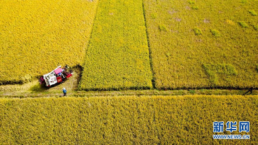 10月21日,在棗莊市臺(tái)兒莊區(qū)邳莊鎮(zhèn),收割機(jī)在收獲水稻(無人機(jī)照片)。