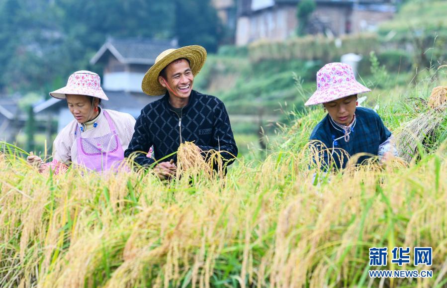貴州省從江縣加榜鄉(xiāng)加車村的農(nóng)民在收割水稻(9月19日攝)。