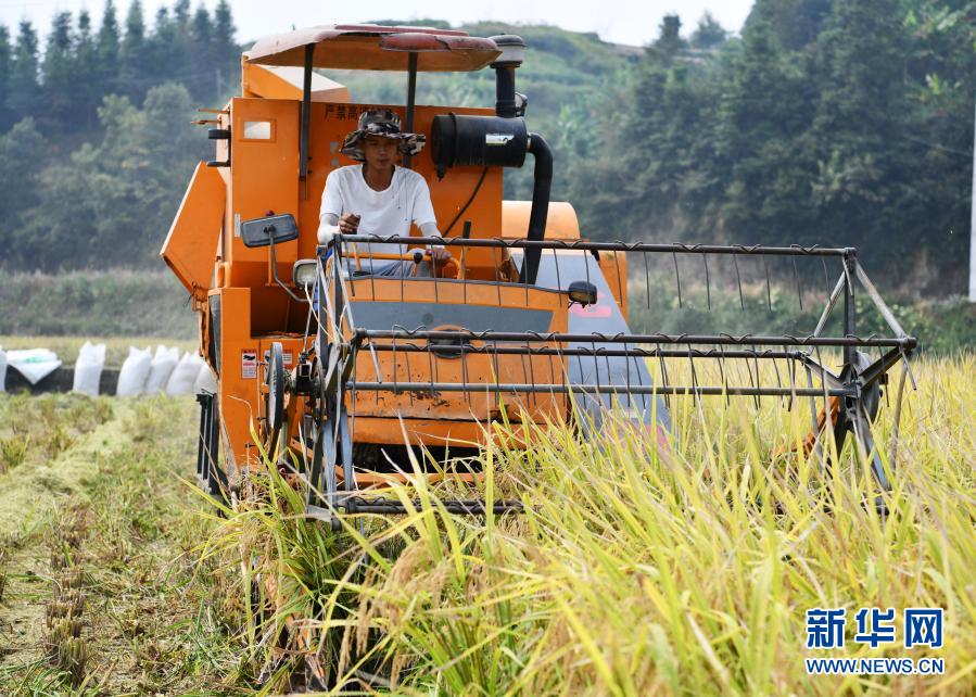 貴州省天柱縣高釀鎮(zhèn)上花村的農(nóng)民在駕駛收割機收割水稻(9月2日攝)。