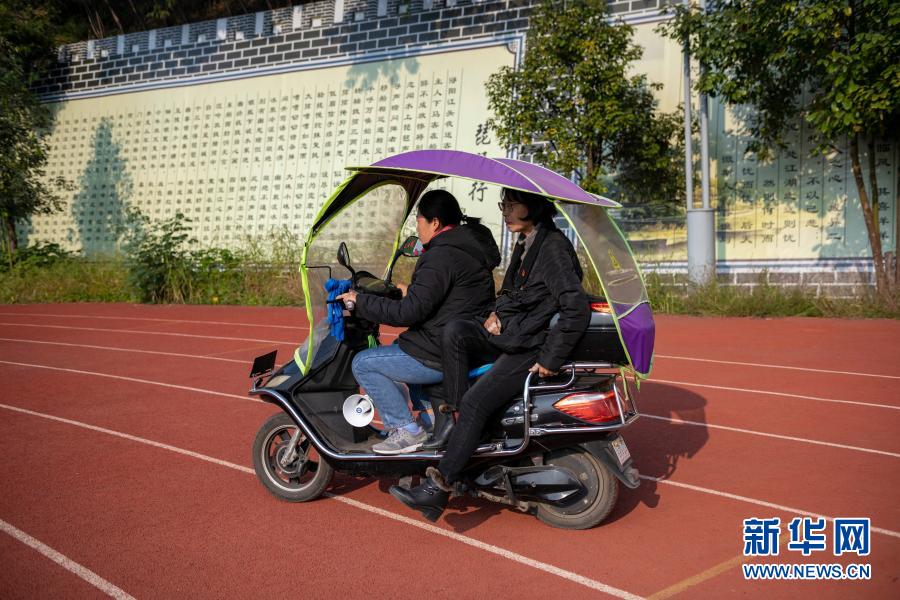 因?yàn)橥饶_不便,張桂梅(后)坐車(chē)從田徑場(chǎng)回教學(xué)樓(11月30日攝)。新華社發(fā)(陳欣波 攝)