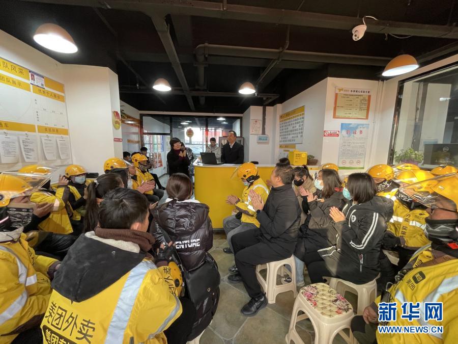 在寧夏回族自治區(qū)吳忠市同心縣,“啟夢筑夢”青年講師團(tuán)講師楊克斌為30多名外賣配送員開展“微宣講”(12月8日攝)。新華社記者 馬麗娟 攝
