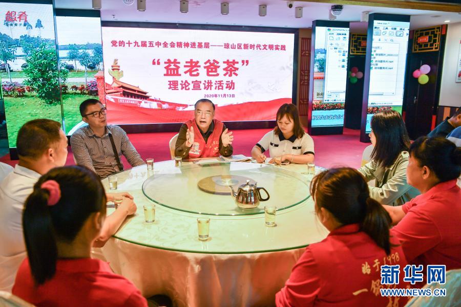 11月13日,海南省??谑协偵絽^(qū)紅城湖邊的一家老爸茶館內(nèi),退休老干部郭仁忠在宣講黨的十九屆五中全會精神。新華社發(fā)(龍泉 攝)
