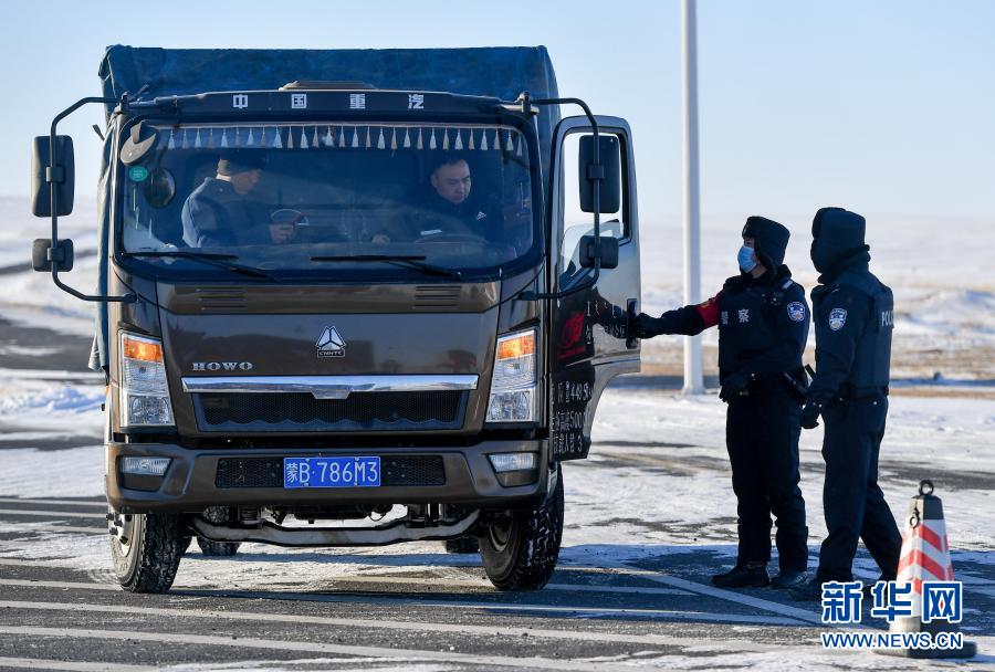 12月15日,內(nèi)蒙古烏蘭察布邊境管理支隊腦木更邊境派出所民警在主著陸場區(qū)附近檢查來往車輛。新華社記者 連振 攝