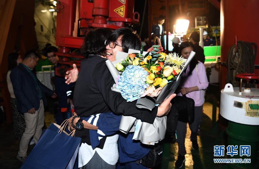 12月21日,“奮斗者”號(hào)海試保障母船“探索二號(hào)”靠泊三亞,科考隊(duì)員和前來(lái)迎接的家屬一起離船。新華社記者 趙穎全 攝