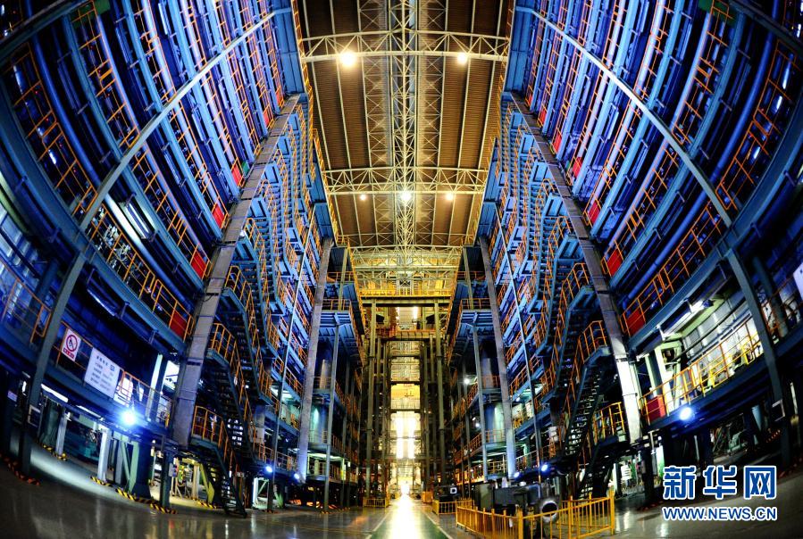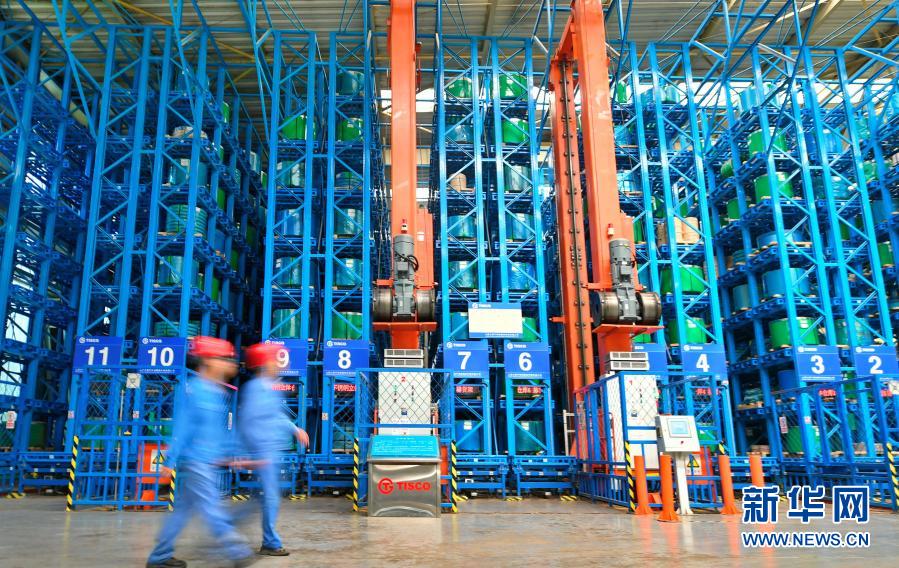 太鋼集團員工走過超薄帶狀不銹鋼立體倉庫(2019年5月24日攝)。新華社記者 曹陽 攝