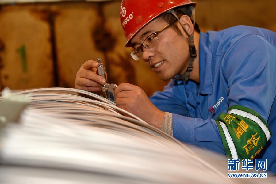 太鋼集團的質(zhì)檢人員在檢驗“筆尖鋼”鋼絲的質(zhì)量(2017年1月10日攝)。新華社記者 曹陽 攝