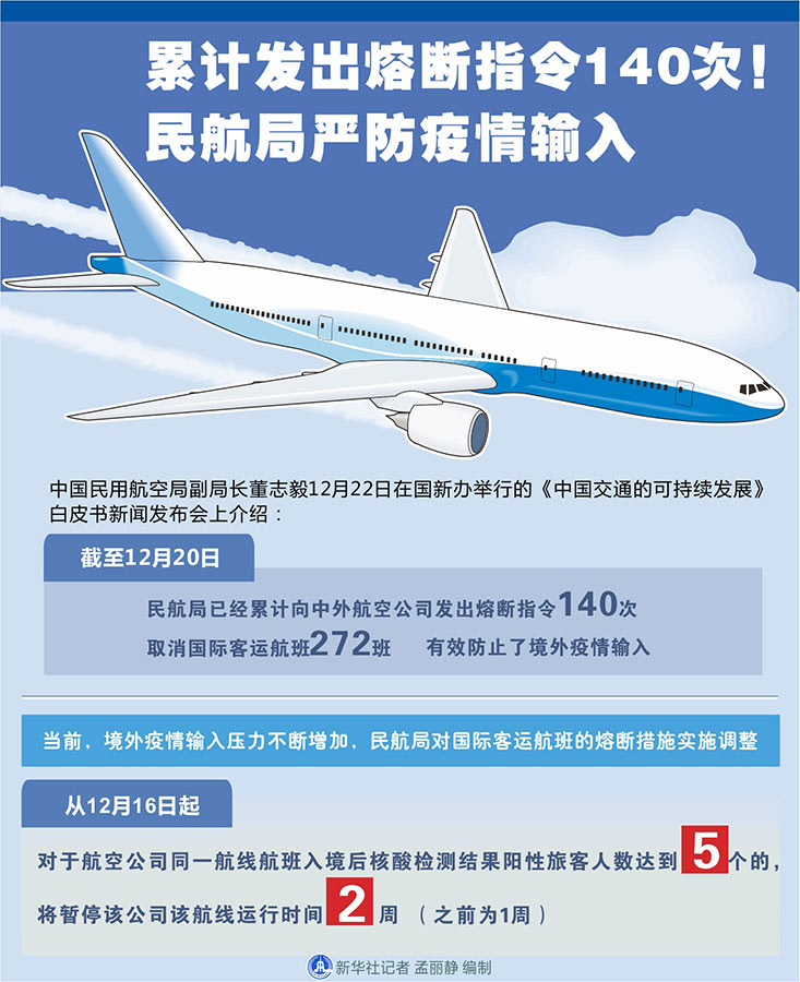 新華社北京12月22日電(記者周圓、魏玉坤)中國民用航空局副局長董志毅22日在國新辦舉行的《中國交通的可持續(xù)發(fā)展》白皮書新聞發(fā)布會(huì)上介紹,截至12月20日,民航局已經(jīng)累計(jì)向中外航空公司發(fā)出熔斷指令140次,取消國際客運(yùn)航班272班,有效防止了境外疫情輸入。