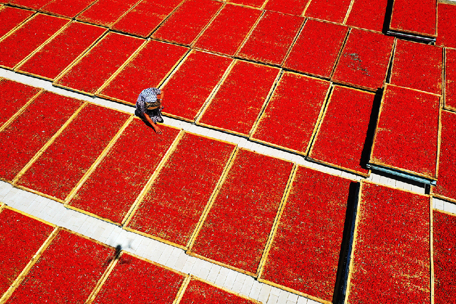 ????2020年7月19日,甘肅省張掖市高臺(tái)縣黑泉鎮(zhèn)十壩村,當(dāng)?shù)剞r(nóng)民正在戈壁灘上晾曬成熟的枸杞。鄭耀德 攝