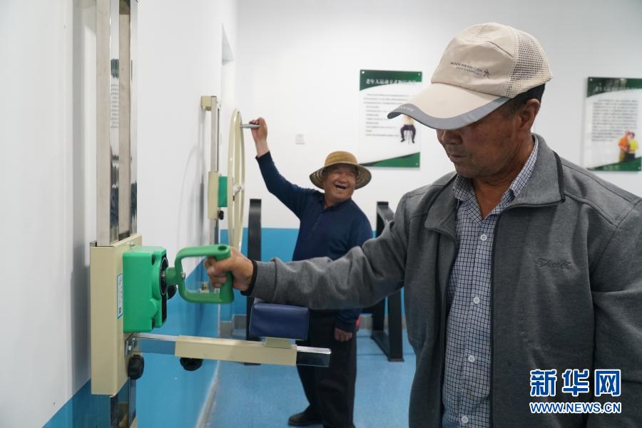 8月13日,在西寧市湟中區(qū)多巴鎮(zhèn)黑嘴村老年之家里,老人們?cè)诮∩硎覂?nèi)鍛煉身體。新華社記者 張子琪 攝