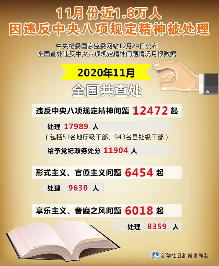 新華社北京12月24日電(記者孫少龍)中央紀(jì)委國家監(jiān)委網(wǎng)站24日公布全國查處違反中央八項規(guī)定精神問題情況月報數(shù)據(jù)。通報顯示,2020年11月,全國共查處違反中央八項規(guī)定精神問題12472起,處理17989人(包括51名地廳級干部、943名縣處級干部),給予黨紀(jì)政務(wù)處分11904人。