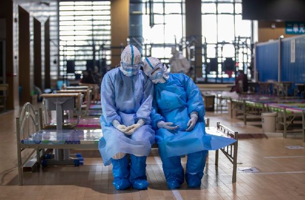 3月10日,武漢武昌方艙醫(yī)院休艙,劉海婷和許國(guó)娟自愿報(bào)名去做最后的消殺工作,在等待出艙的時(shí)候,她們覺(jué)得有點(diǎn)累,便坐下來(lái)休息了一會(huì)兒。