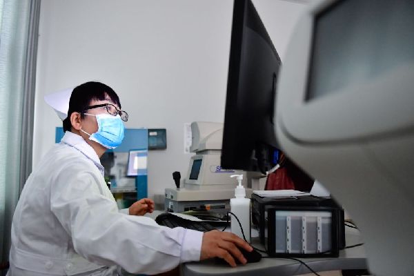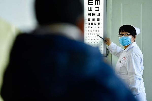 12月16日,海東市第二人民醫(yī)院眼科護(hù)士許國(guó)娟在給患者檢查視力。