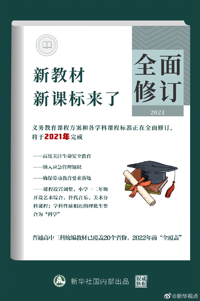 中小學(xué)校開什么課?學(xué)什么?怎么學(xué)?12月24日,教育部召開新聞發(fā)布會介紹,義務(wù)教育課程方案和各學(xué)科課程標(biāo)準(zhǔn)正在全面修訂,將于2021年完成。此外,普通高中道德與法治(思想政治)、語文、歷史三科統(tǒng)編教材已覆蓋20個省份,2022年前將實現(xiàn)所有省份“全覆蓋”,到2025年實現(xiàn)所有年級“全覆蓋”。(記者胡浩 海報設(shè)計張晨光)