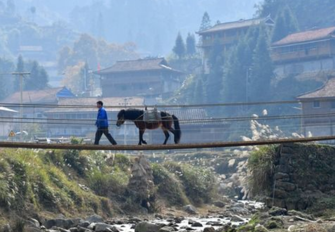 在烏英苗寨,村民走在剛剛建成的鐵索橋上(12月25日攝)。新華社記者 黃孝邦 攝