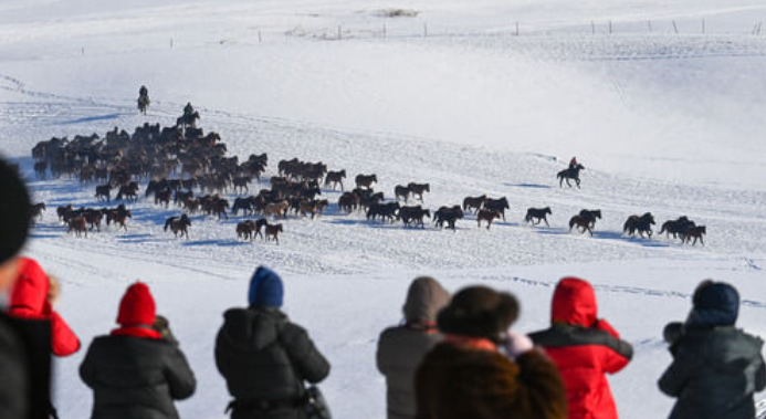 游客在昭蘇縣天馬旅游文化園拍攝“萬(wàn)馬奔騰“(12月20日攝)。新華社記者 丁磊 攝