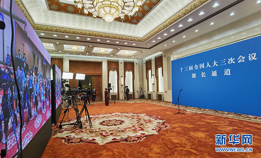 5月22日,十三屆全國(guó)人大三次會(huì)議開(kāi)幕會(huì)結(jié)束后,首場(chǎng)“部長(zhǎng)通道”采訪活動(dòng)在人民大會(huì)堂新聞發(fā)布廳舉行,邀請(qǐng)部分列席會(huì)議的國(guó)務(wù)院有關(guān)部委負(fù)責(zé)人通過(guò)網(wǎng)絡(luò)視頻方式接受采訪。圖為“部長(zhǎng)通道”現(xiàn)場(chǎng)。新華網(wǎng) 王翰林 攝