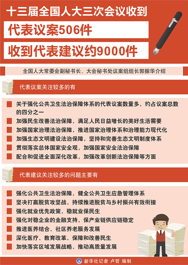 新華社北京5月26日電 記者26日從十三屆全國(guó)人大三次會(huì)議秘書處獲悉,到大會(huì)主席團(tuán)決定的代表提出議案截止時(shí)間5月25日12時(shí),大會(huì)秘書處共收到代表提出的議案506件。同時(shí),收到代表建議約9000件。