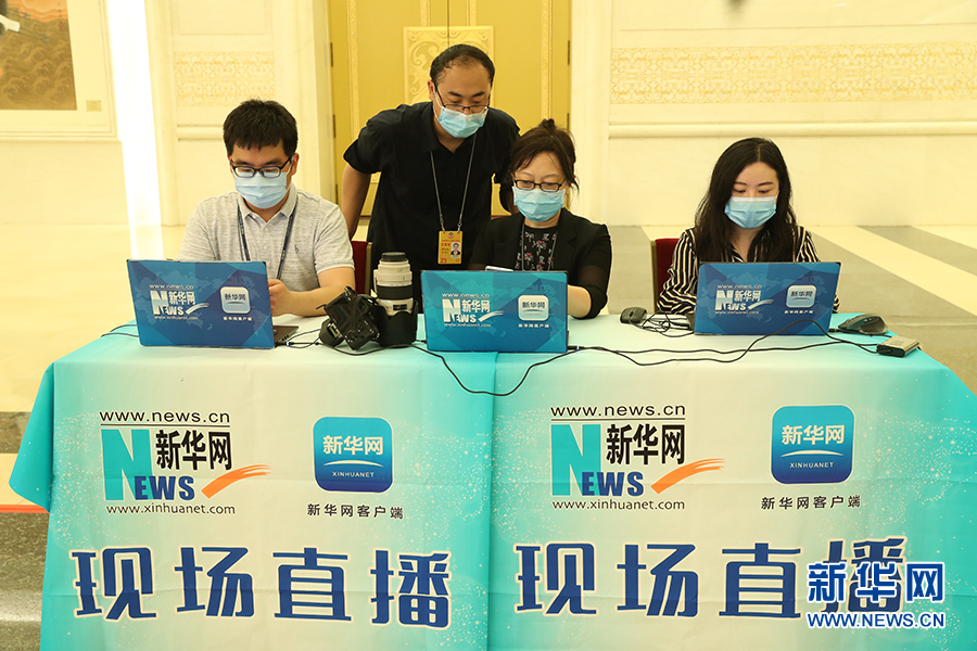 2020年5月28日下午十三屆全國(guó)人大三次會(huì)議閉幕后,國(guó)務(wù)院總理李克強(qiáng)在人民大會(huì)堂三樓金色大廳出席記者會(huì)并回答中外記者提問。為有效防控疫情,共同維護(hù)公共衛(wèi)生與健康,記者會(huì)采用網(wǎng)絡(luò)視頻形式進(jìn)行。圖為新華網(wǎng)現(xiàn)場(chǎng)直播團(tuán)隊(duì)。 新華網(wǎng) 王翰林 攝