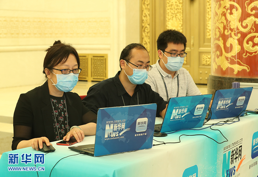 2020年5月28日下午十三屆全國人大三次會(huì)議閉幕后,國務(wù)院總理李克強(qiáng)在人民大會(huì)堂三樓金色大廳出席記者會(huì)并回答中外記者提問。為有效防控疫情,共同維護(hù)公共衛(wèi)生與健康,記者會(huì)采用網(wǎng)絡(luò)視頻形式進(jìn)行。圖為新華網(wǎng)現(xiàn)場直播團(tuán)隊(duì)。 新華網(wǎng) 王翰林 攝