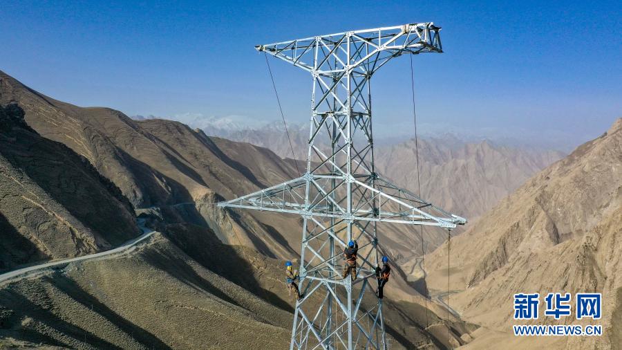 2020年4月28日,在新疆葉城縣南部山區(qū)海拔3100多米的阿卡孜達坂上,工人登上鐵塔檢修零部件,為放線做準備(無人機照片)。