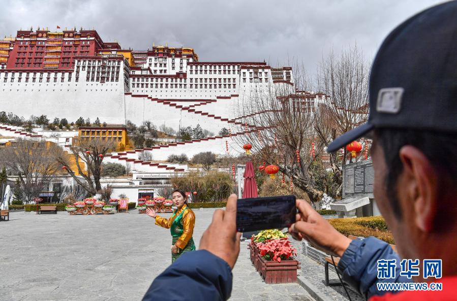 2020年3月1日,西藏布達拉宮管理處的講解員次仁卓嘎(左)在進行直播。