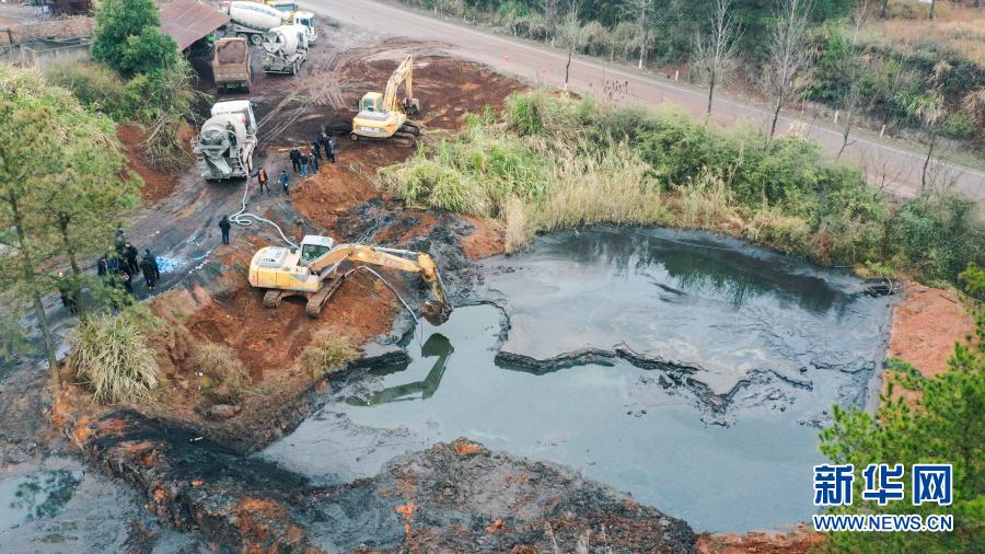 1月7日,在湖南省茶陵縣洣江街道諸睦村和建礦業(yè)有限公司,茶陵縣多部門工作人員在抓緊清理尾礦庫的廢水和淤泥(無人機(jī)照片)。 新華社發(fā)