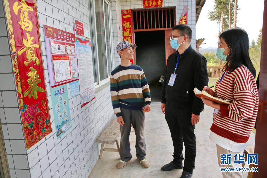 紀(jì)檢監(jiān)察干部向四川洪雅縣中山鎮(zhèn)鄒崗村建檔立卡貧困戶楊德彬(左一)核實產(chǎn)業(yè)扶貧資金落實情況(2020年3月18日攝)。新華社記者 江宏景 攝