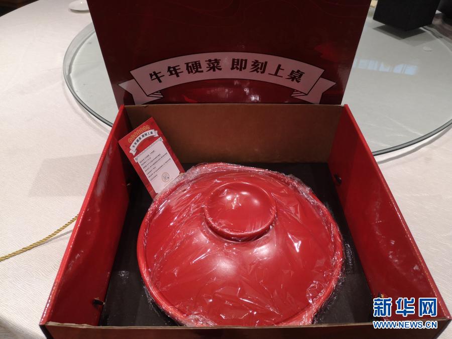 這是2月17日在成都一家中餐廳拍攝的春節(jié)期間推出的半成品“牛年硬菜”干燒海參的包裝禮盒(手機(jī)照片)。新華社記者 胡旭 攝