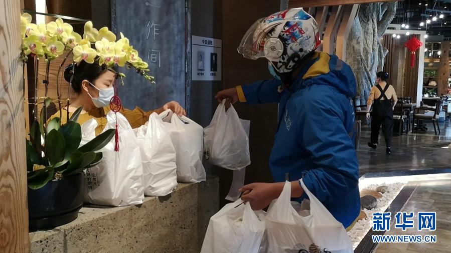 2月17日,外賣(mài)配送員在成都一家火鍋店交接消費(fèi)者在線(xiàn)上下單的外賣(mài)火鍋(手機(jī)照片)。新華社記者 胡旭 攝